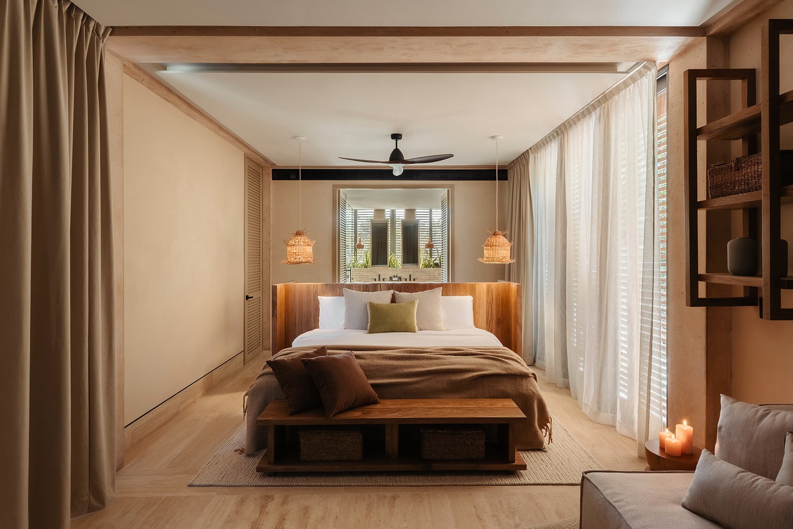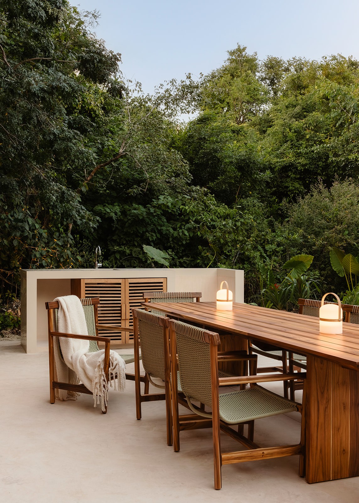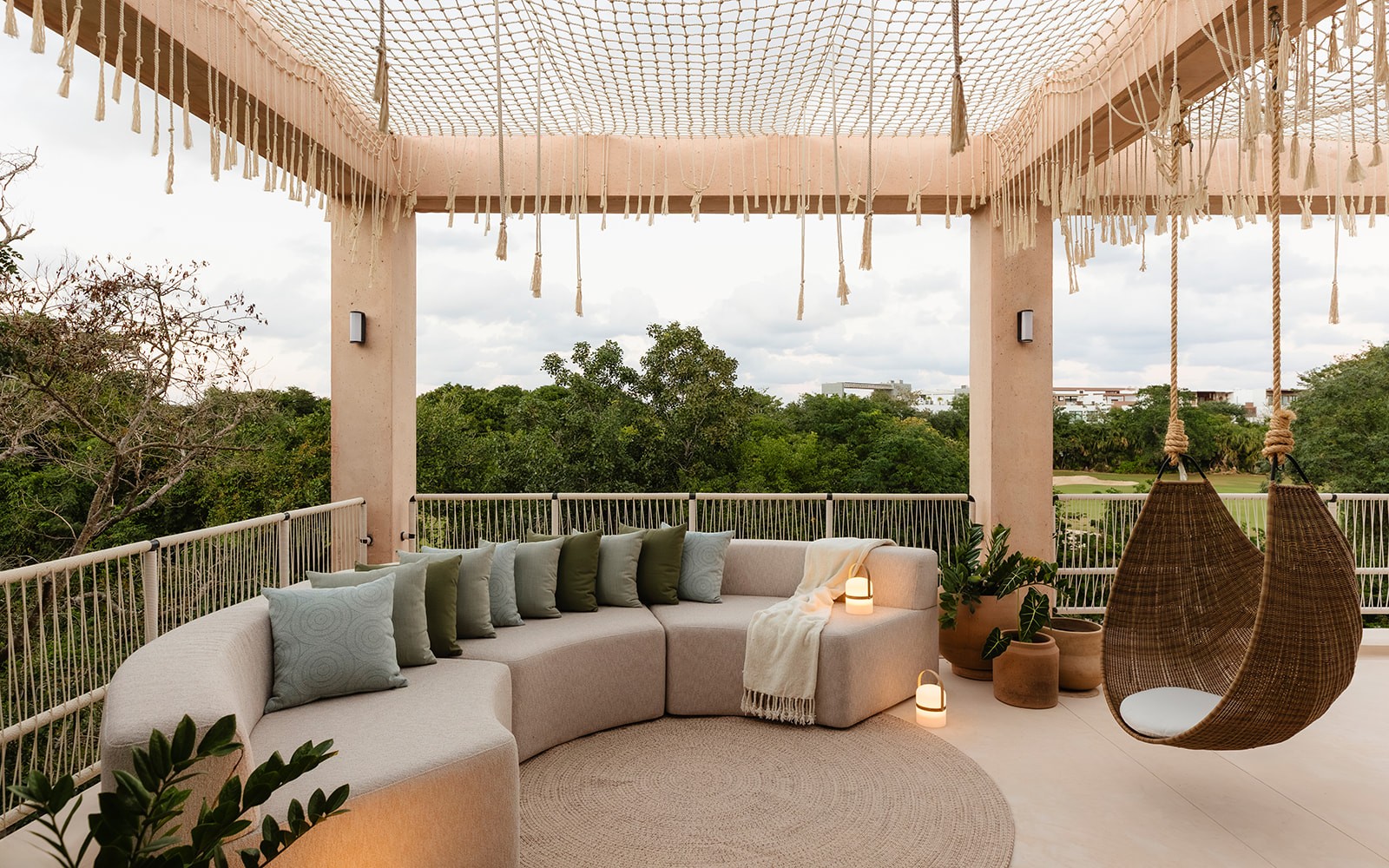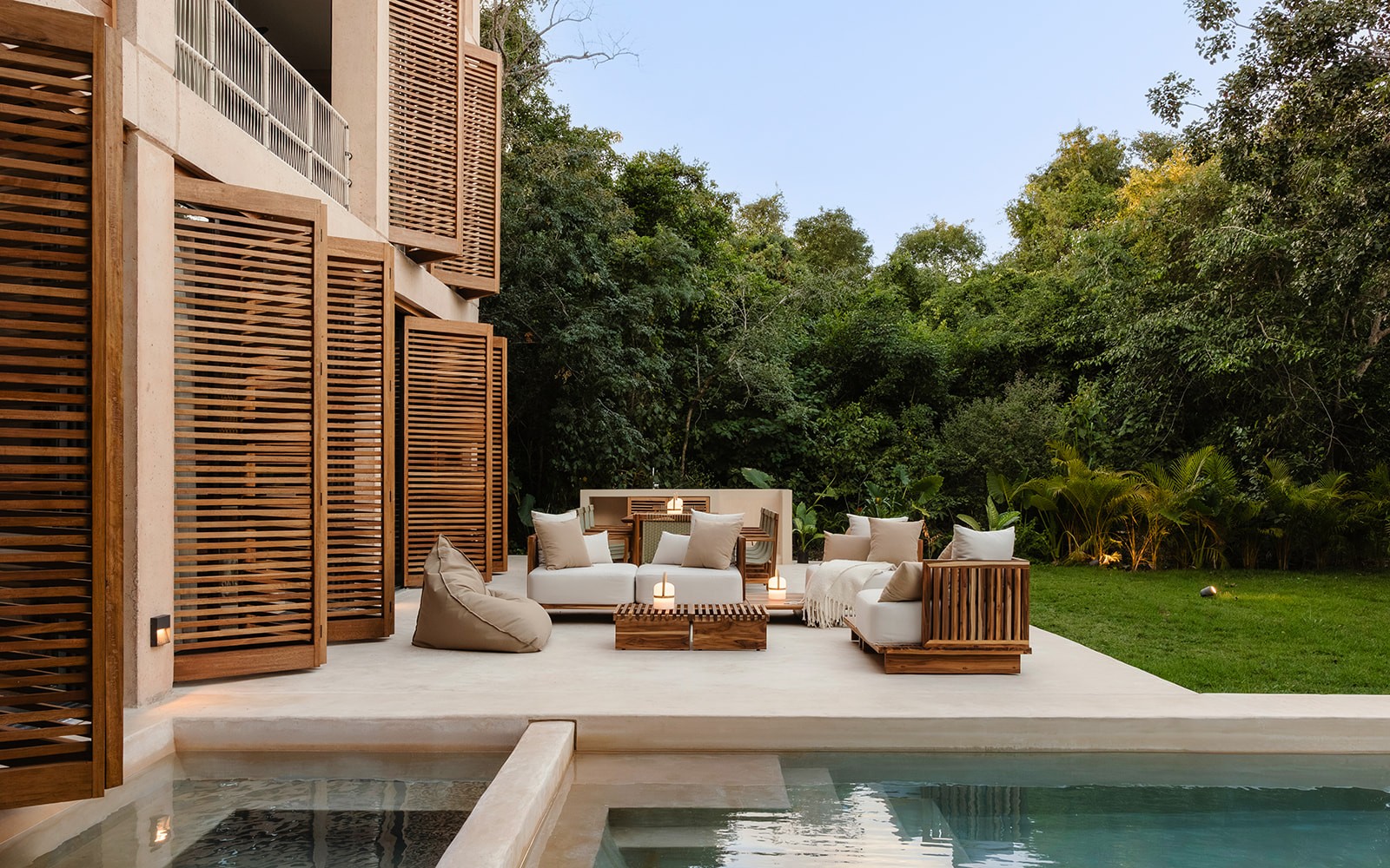 Natural maculí wood in a matte finish highlights its grain and balances the palette. Texture brings depth through marble, linen, natural fibers and terracotta. Contemporary Mexican design pieces and lush greenery add identity, while the teak outdoor area was conceived as a seamless extension of the social spaces indoors.