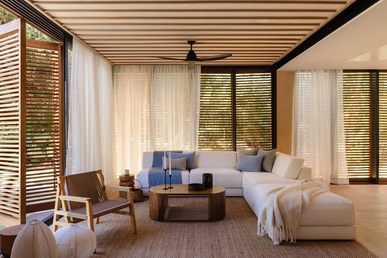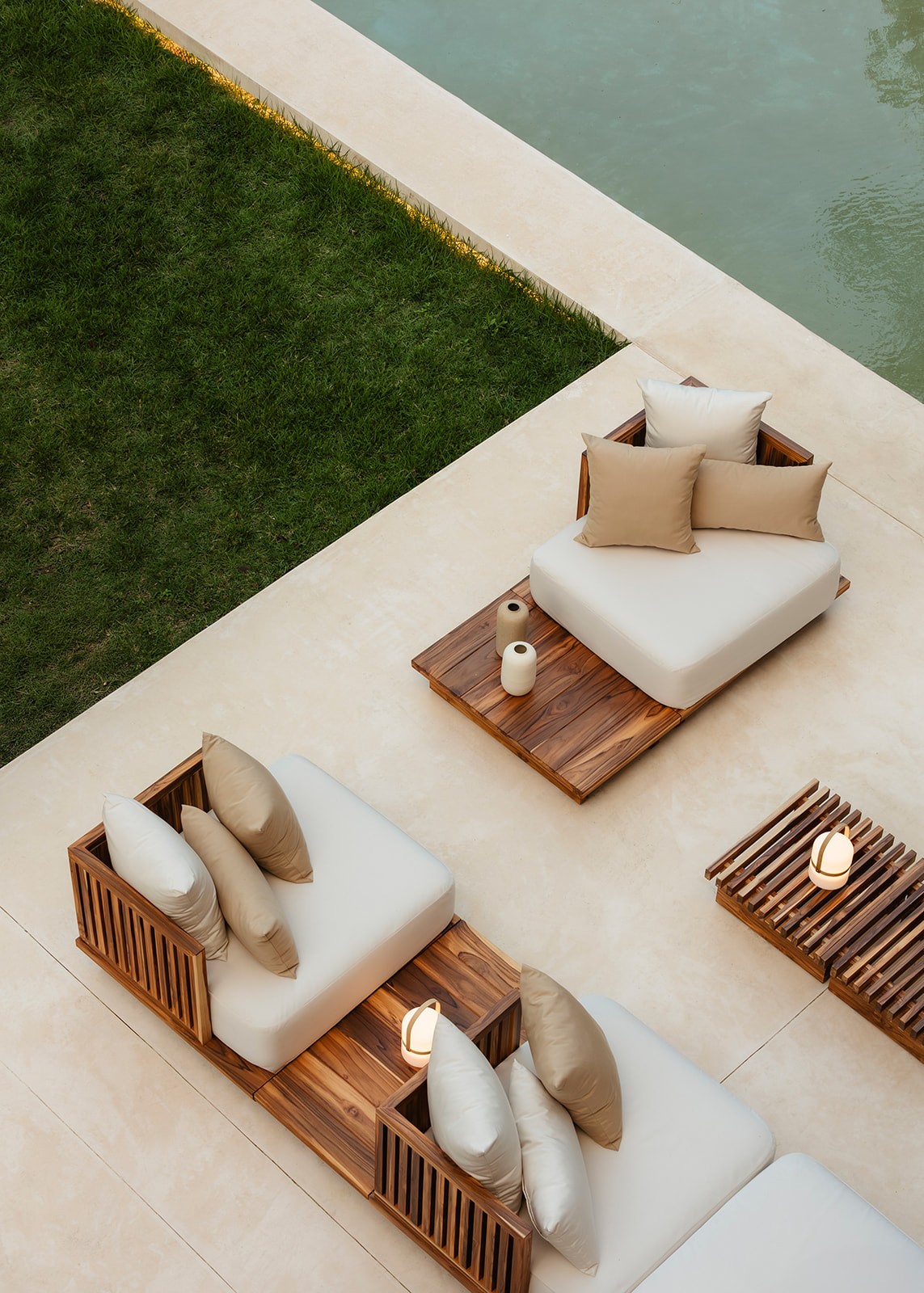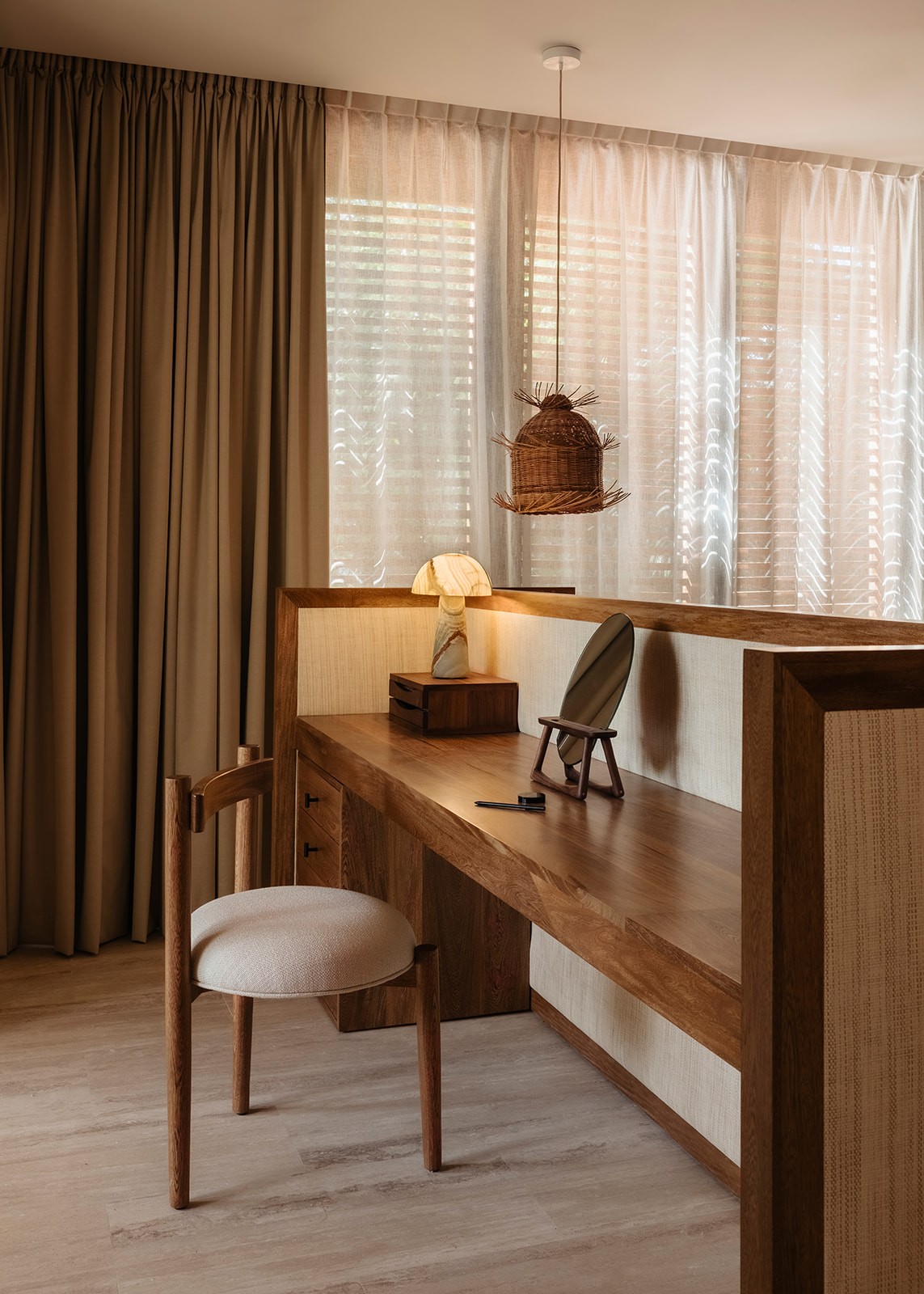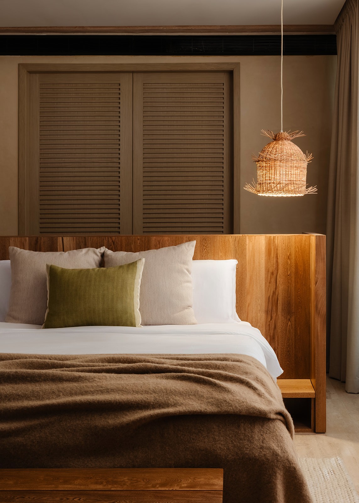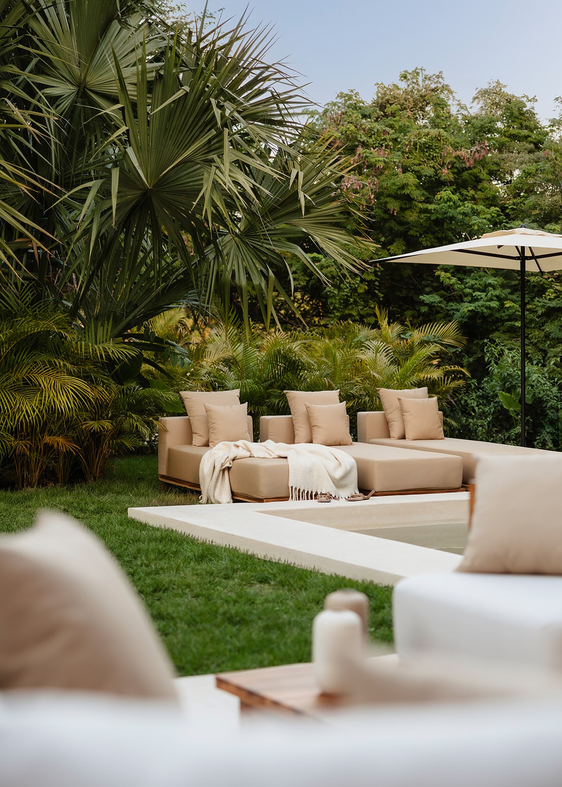 Natural maculí wood in a matte finish highlights its grain and balances the palette. Texture brings depth through marble, linen, natural fibers and terracotta. Contemporary Mexican design pieces and lush greenery add identity, while the teak outdoor area was conceived as a seamless extension of the social spaces indoors.
