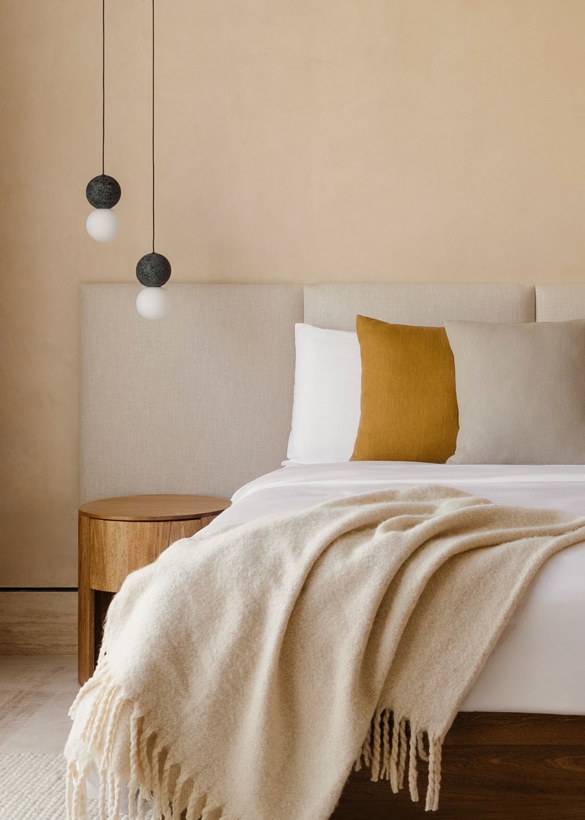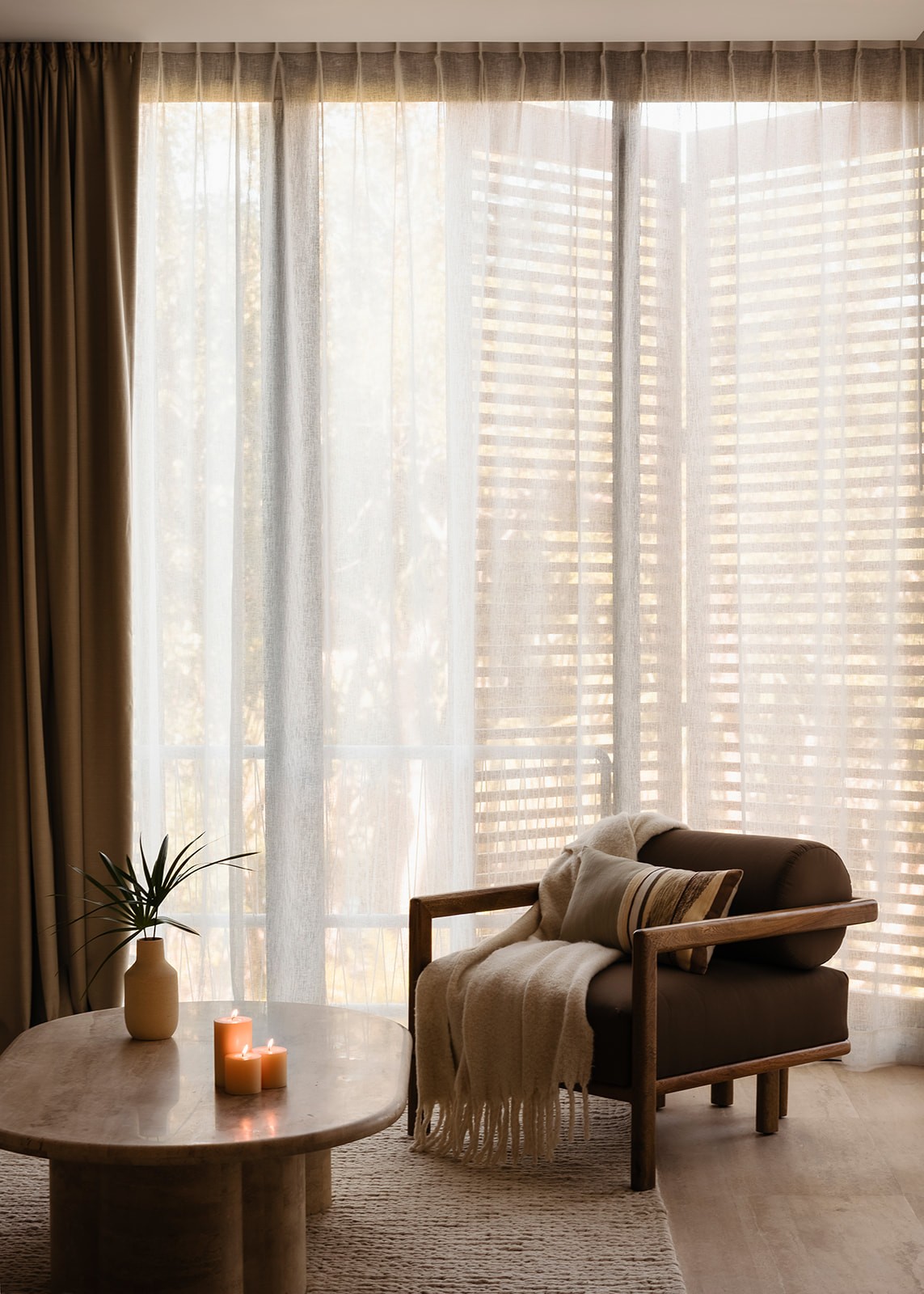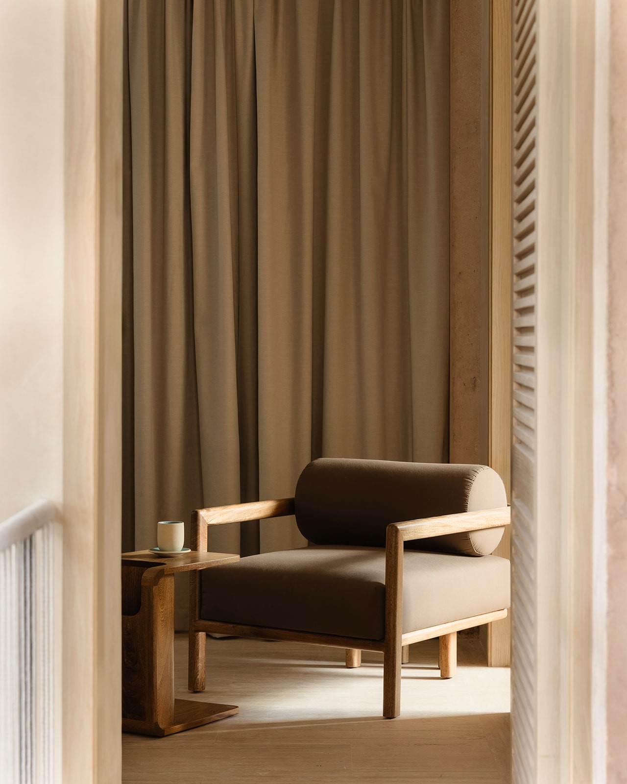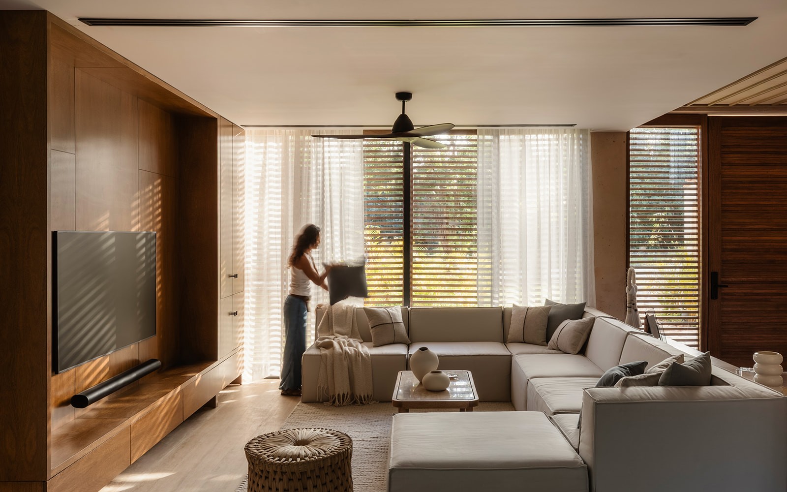 Natural maculí wood in a matte finish highlights its grain and balances the palette. Texture brings depth through marble, linen, natural fibers and terracotta. Contemporary Mexican design pieces and lush greenery add identity, while the teak outdoor area was conceived as a seamless extension of the social spaces indoors.